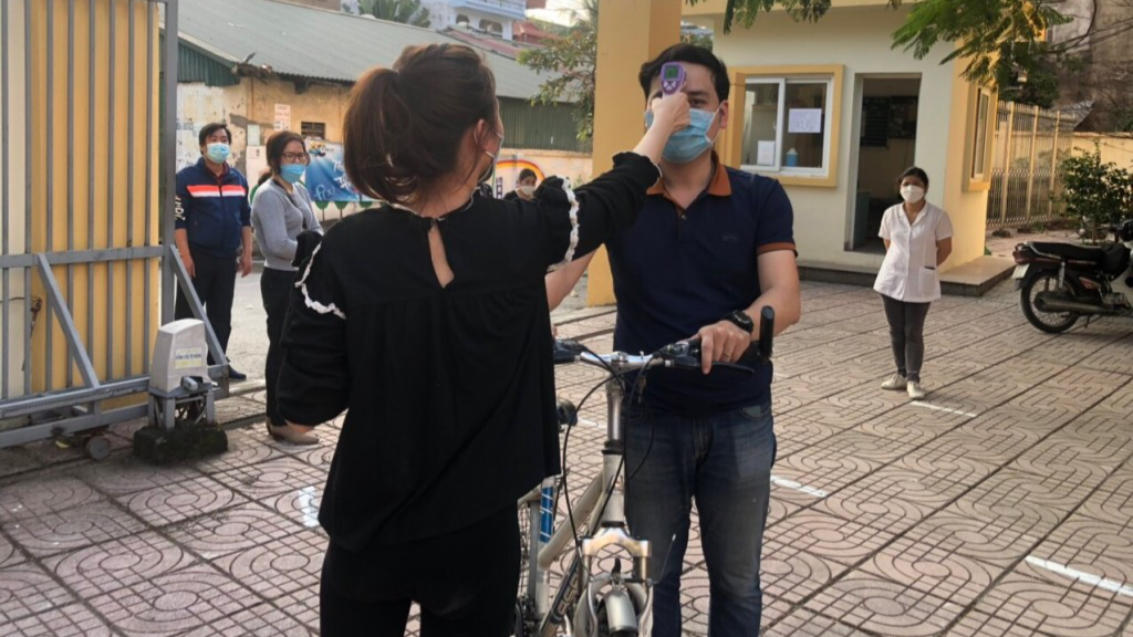 Giáo viên trường THCS Đức Giang đo thân nhiệt cho học sinh
