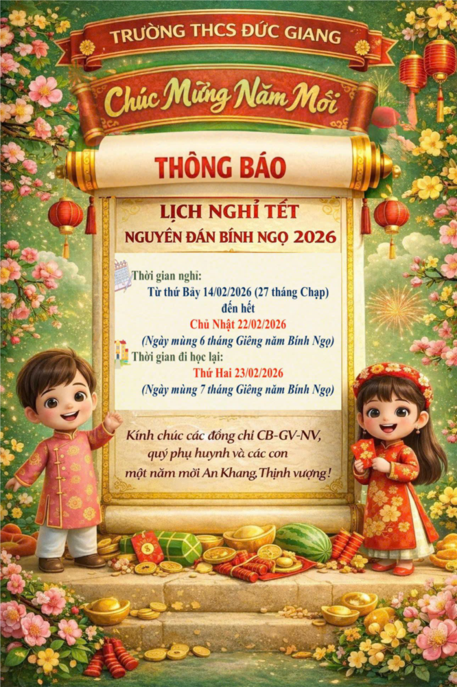 Trường THCS Đức Giang trân trọng thông báo tới quý phụ huynh, các thầy cô giáo và các em học sinh lịch nghỉ Tết Nguyên đán Bính Ngọ 2026 như sau: