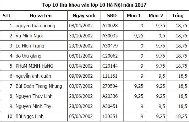 Học sinh Hà Nội tham gia kỳ thi vào lớp 10 THPT với 2 môn Toán và Ngữ văn vào ngày 9/6/2017. Học sinh thi vào lớp chuyên thi thêm các môn chuyên vào ngày 10 và 11/6. Trong số hơn 76.000 thí sinh dự thi, chỉ 57.000 thí sinh thi vào công lập. Trong đó, 67% học sinh được học công lập, hơn 20% học tư thục, 5% học ở các trung tâm giáo dục thường xuyên và số còn lại học ở các trường trung cấp chuyên nghiệp. Và đến ngày 21/6, Sở GD&ĐT Hà Nội công bố điểm thi của hơn 76.000 thí sinh tham gia kỳ thi tuyển sinh vào lớp 10 năm nay.