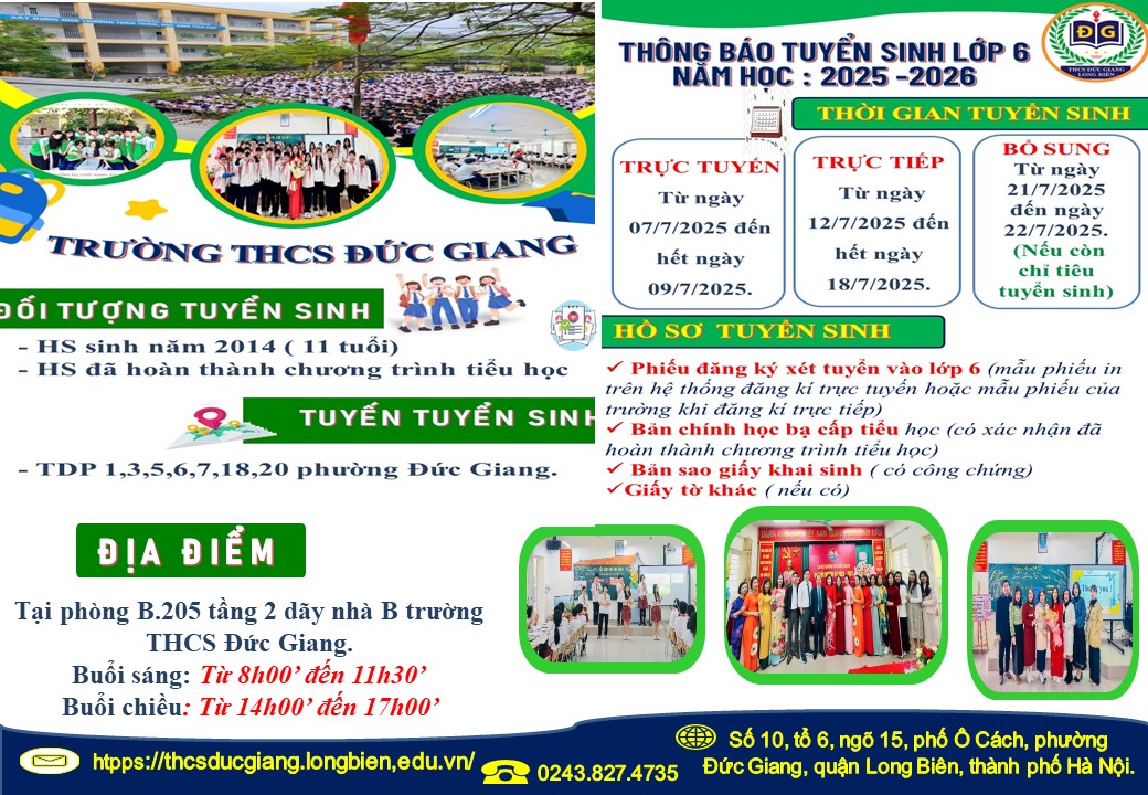 Địa điểm hỗ trợ tuyển sinh trực tuyến và nộp hồ sơ trực tiếp: tại phòng Hội đồng tầng 2 tòa B trường THCS Đức Giang